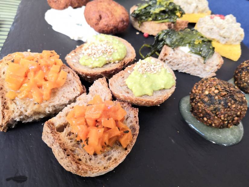 Il menù cambia abbastanza spesso per la stagionalità dei prodotti, noi abbiamo preso un antipasto misto nel quale possiamo trovare: quadretti di polenta con paté di funghi di bosco, falafel di ceci e sesamo tostato su dressing ai cetrioli, polpettine di quinoa e spinaci su riduzione di arance e zenzero, bruschette di avocado, friarielli su paté di cannellini, zucca grigliata. Un buon ingresso nel mondo Veg, vario e gustoso.
